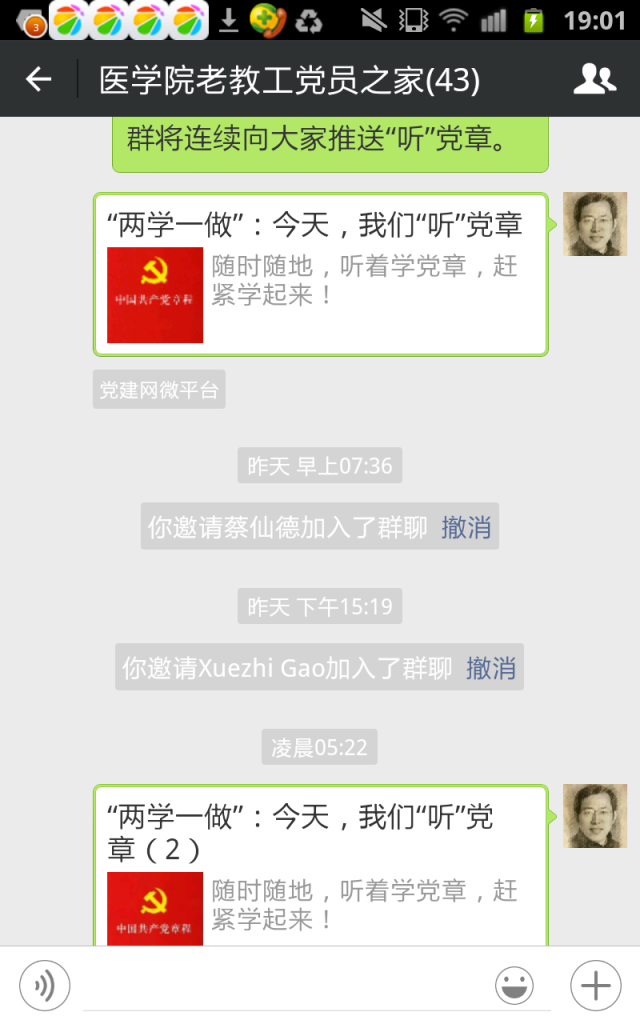 “两学一做”,基础在学。根据退休党支部的实际,部分党员提出利用移动新媒体的优势,组建退休党支部“微党员之家”的倡议得到与会人员一致同意。在原有退协群聊的基础上,当即另外组建了“伟德国际1946官网老教工党员之家”微信群,由专人负责,坚持经常推送有关移动新媒体客户端“两学一做”学习教育的专题学习资料及本支部党内活动的有关通知和图文报道。
