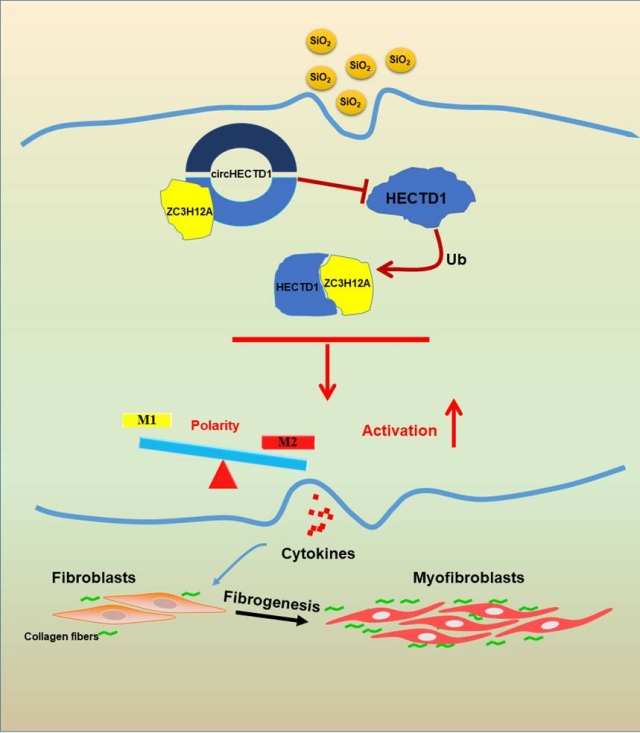 该研究探讨了环状RNA-circHECTD1R是否能够通过泛素化参与矽肺中巨噬细胞活化,继而影响矽肺纤维化的进程,以期为临床诊断及治疗提供靶点。CircHECTD1对于细胞的调控作用目前报道较少,本研究关注circHECTD1经与MCPIP1介导的泛素化,影响下游HECTD1的表达,参与肺泡巨噬细胞极性转化,释放相关炎性因子和至纤维化因子,最终加速纤维化过程。结果表明circHECTD1/MCPIP1/HECTD1可能是矽肺炎症和纤维化的有效干预靶点。