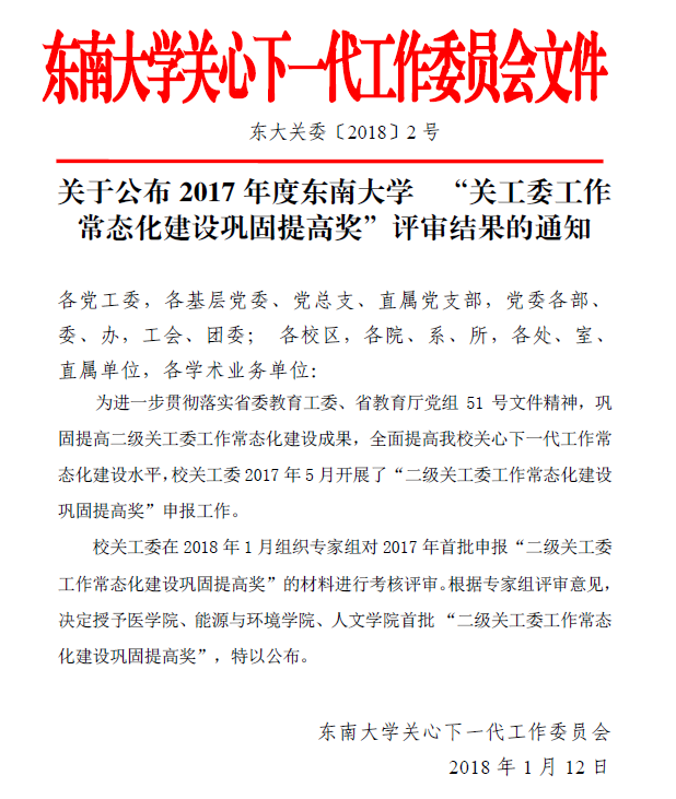 据悉,为进一步贯彻落实省委教育工委、省教育厅党组51号文件精神,巩固提高二级关工委工作常态化建设成果,全面提高公司工作常态化建设水平,校关工委于2017年5月开展了“二级关工委工作常态化建设巩固提高奖”申报工作。2018年1月校关工委组织专家对2017年首批申报“二级关工委工作常态化建设巩固提高奖”的材料进行考核评审。根据专家组评审意见,决定授予伟德国际1946官网、能源与环境学院、人文学院首批“二级关工委工作常态化建设巩固提高奖”。