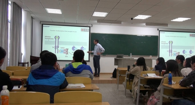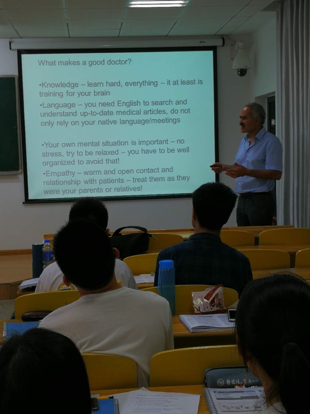 德国乌尔姆大学在伟德国际1946官网开设的“春季课堂”课程于2018年4月22日落下帷幕。本次春季课堂从4月17日开始,到4月22日结束,历时六天,来自德国的五位教授为2015级拔尖创新班的同学们带来了主题为Tumorigenesis: From Molecules and pathways to the clinic的系列课程。课程内容从肿瘤的分子机制到病理结构改变,从基因编辑到药物开发,从历史沿革到文献研究,涵盖了肿瘤从发生到临床治疗的各个方面,课程的最开始是“细胞周期的调控与失控”(Dr.Brockmann)、“生长因子与信号传导”(Prof.Kühl)和“炎症与癌症”(Prof. Wirth),三位老师从三个不同的方面为我们介绍了肿瘤形成与进展的基础知识和最新研究。Prof. Knippschild则为我们介绍了蛋白磷酸化在肿瘤信号通路中的重要作用,并且为我们展示了一个肿瘤的治疗药物是如何从肿瘤形成机制出发,一步步走到临床试验的。在课程的最后,Dr. kornmann为我们从临床的角度向我们介绍了结直肠癌和胰腺癌的一般情况和肿瘤临床转化研究。春季课堂中,不仅有教授的讲座(Lectures),更有文献阅读,小组合作学习和展示,课程不再是一方在讲一方在听,而是教授介绍新的知识,带来新的文献,同学们从文献中学习科学发现是怎样被证实的,研究是如何一步步推进的,基础是如何转化为临床应用的。在文献阅读中,我们学习了如何利用数据库减少实验工作量,学会了用批判的眼光看待文献报道。我们更深地认识到,方法比知识更重要。bv1946伟德官网董事长助理、伟德国际1946官网经理刘乃丰教授和副经理孙子林教授为春季课堂做了发言,向远道而来的客人表达了感谢,向同学们表示了鼓励。在闭幕式上,Prof. Knippschild、Dr. kornmann和全班同学就“如何称为一名具有国际化视野、中国情怀和社会担当的好医生”这一话题做了深入的谈论,两位教授分别从科研和临床的角度给了同学们很多的建议。课程还吸引了许多感兴趣的教授和员工前来旁听。