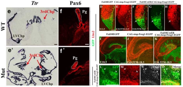 该课题组同时开展了自闭症基因Foxg1对维持端脑发育的信号中心cortical hem和调控上丘脑发育的机制研究。通过将Foxg1过表达于hem可诱导转录因子Lhx2的表达,进而导致hem起源的Cajal-Retius 细胞的命运转化为齿状回颗粒细胞,表明Foxg1对于信号调控中心cortical hem的维持至关重要。而在上丘脑,敲除Foxg1引起缰核细胞不同类型细胞特化异常,松果体变小,脉络丛分枝增多,深入研究表明Foxg1在发育早期调控上丘脑的区域化,从而导致上述症状。以上研究对于深入理解Foxg1突变患者的脉络丛囊肿、严重的焦虑以及睡眠障碍的发生机制。该部分工作由博士生刘斌完成(Molecular Brain, 2018, Feb.; JDB, 2018, June)